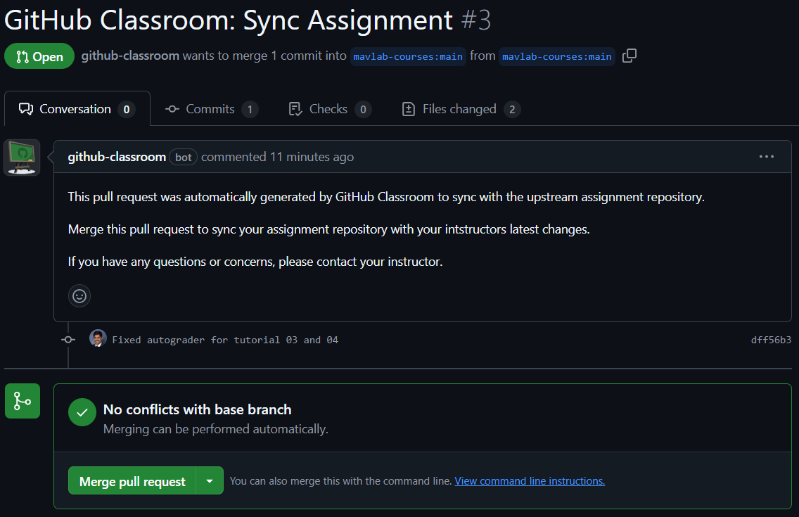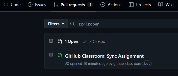 Click on the pull request to open it. You will see that this pull request is created by your instructor through GitHub Classroom.