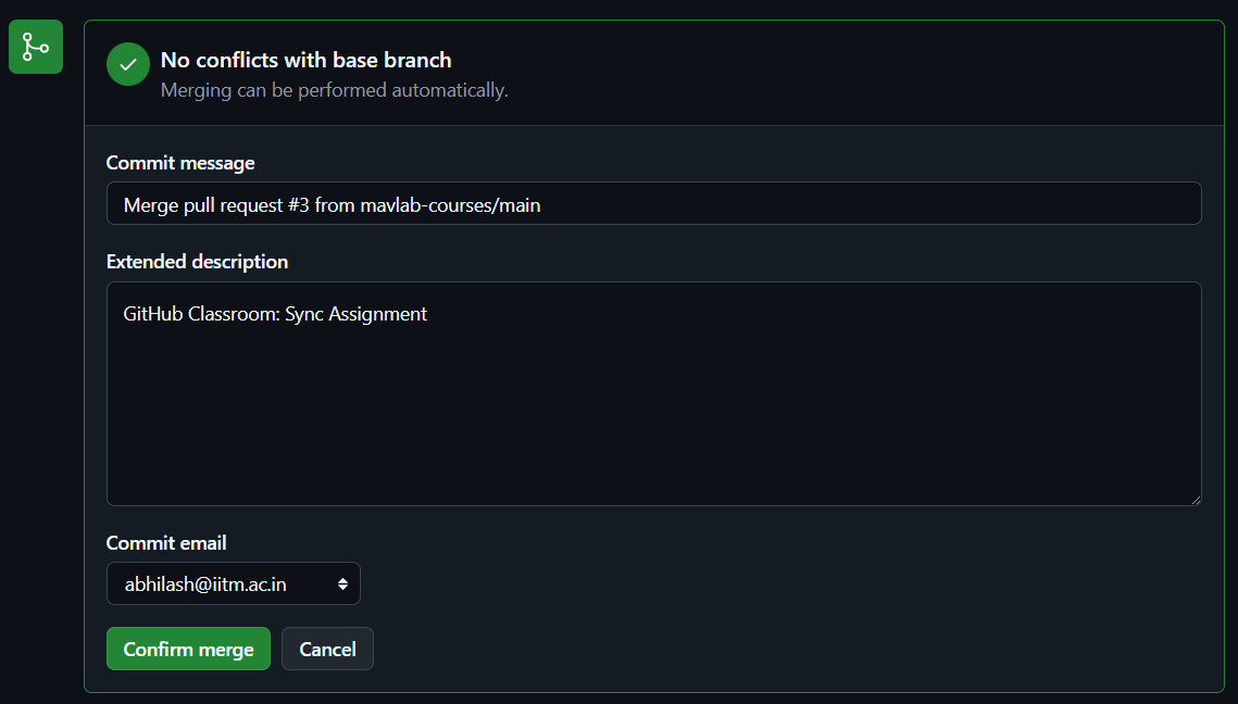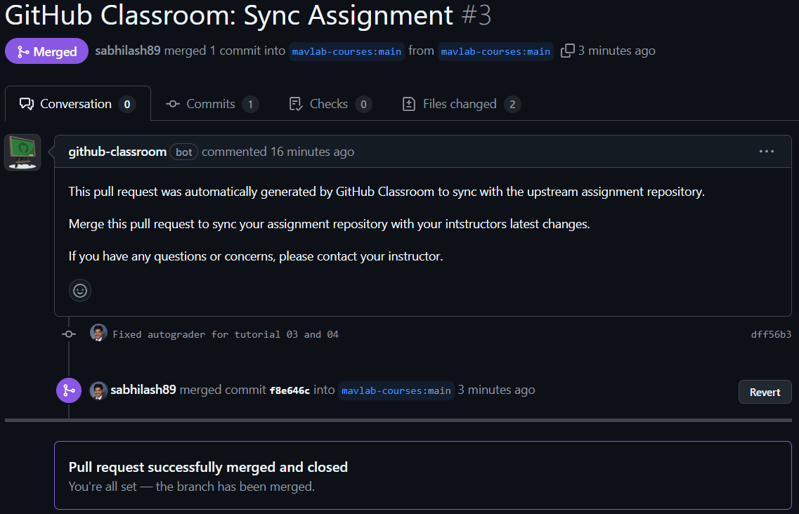 Once your instructor has updated the upstream repository, a pull request will be created on your tutorial repository. You will need to merge this pull request into your tutorial repository.