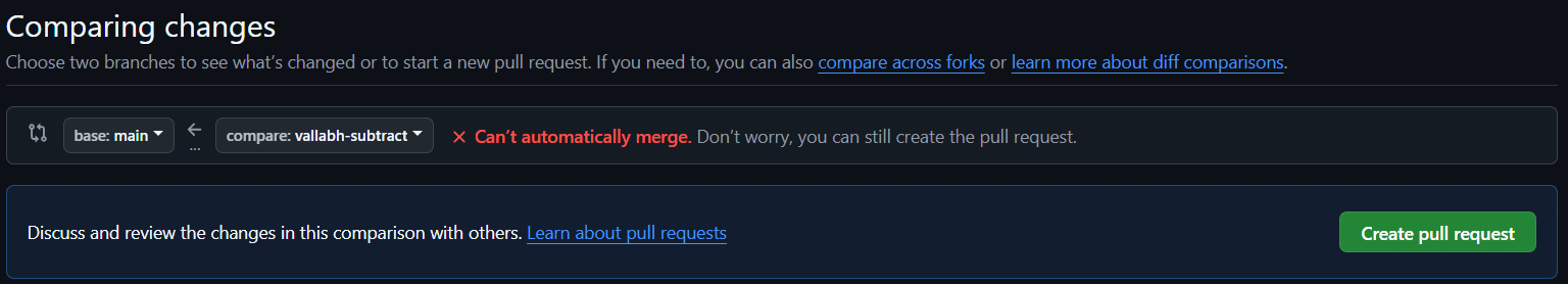 Notice that here GitHub shows the message “Can’t automatically merge”. This means that the pull request can be created but cannot be merged automatically into the main branch due to conflicts. This has happened because while Vallabh implemented the subtract function, Rishabh’s add function was added into the main branch through the pull request we created earlier. Thus the main branch has diverged from the vallabh-subtract branch.