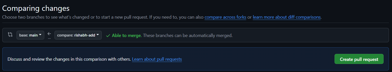This can be performed by navigating to the repository on GitHub and clicking on the “Pull requests” tab and then clicking on the “New pull request” button. This should open up a new page as shown in Figure 6.1. Here select the branch rishabh-add as the compare branch and the branch main as the base branch. Then click on the “Create pull request” button. Rishabh will be prompted to give a title and description for the pull request.