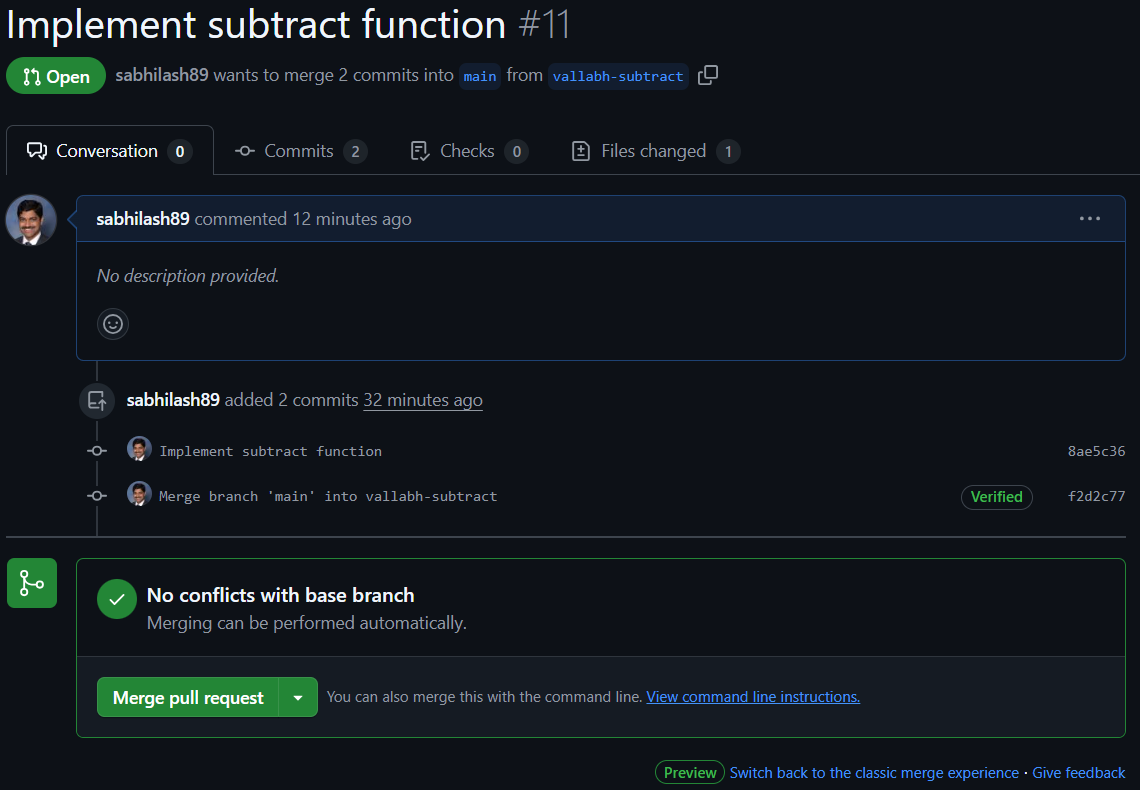 Here we see that the a new commit has been added to the vallabh-subtract branch with the message “merge branch ‘main’ into vallabh-subtract”. Let’s try to understand what this means. We have now made changes on vallabh-subtract branch to incorporate the changes from the main branch and now this branch is ahead of the main branch by 2 commits. This means that the pull request can be merged into the main branch without any conflicts. Notice that here GitHub shows the message “No conflicts with base branch. Merging can be performed automatically”.