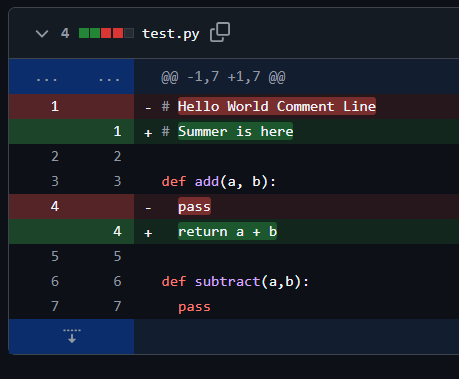 Now when we navigate to the repository on GitHub and see the test.py file on the main branch, we should see the following: